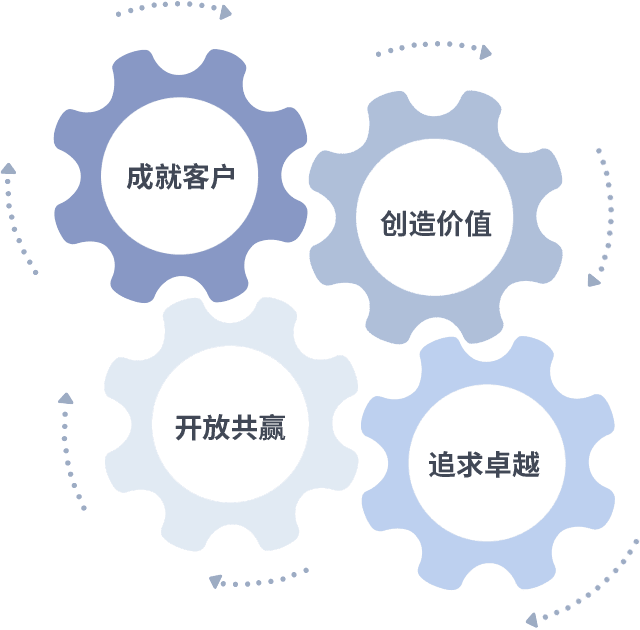 成就客户是一切决策的出发点,,创造价值是衡量所有工作的标准,,,追求卓越是我们做事做人的态度,,开放共赢是我们的格局也是最终的结果。。。价值观的齿轮环环相扣,,,,推动着组织里的每个人不断向前。。。