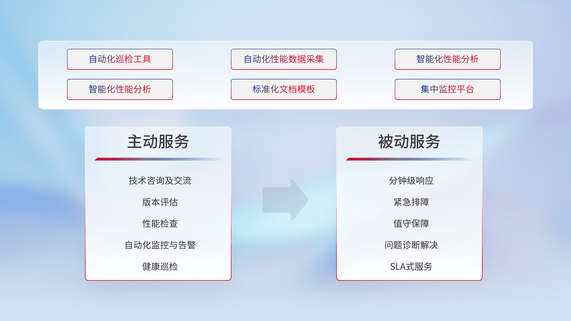 智能化工具和标准化文档,,,保障服务质量,,提供主动服务(包含技术咨询、、、版本评估、、、、性能检查、、、、自动化监控与告警、、、健康巡检)和被动服务包含(分钟级响应、、紧急排障、、、值守保障、、、问题诊断解决、、SLA服务)。。。
